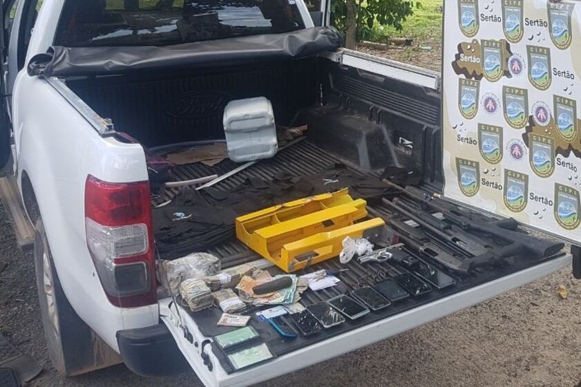 Foram encontrados uma pistola, três espingardas calibre 12, munição calibre 44, parte do dinheiro roubado de um banco e oito celulares