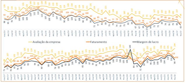 Apesar da escalada da inflação e do aumento da inadimplência, o mês de fevereiro apresentou sinais de otimismo entre os empresários das micro e pequenas indústrias. Segundo, mesmo com a queda da avaliação de faturamento e da margem de lucro, a satisfação com os negócios subiu de 132 pontos para 144 pontos, o mais alto índice desde janeiro de 2020 (veja gráfico abaixo).
