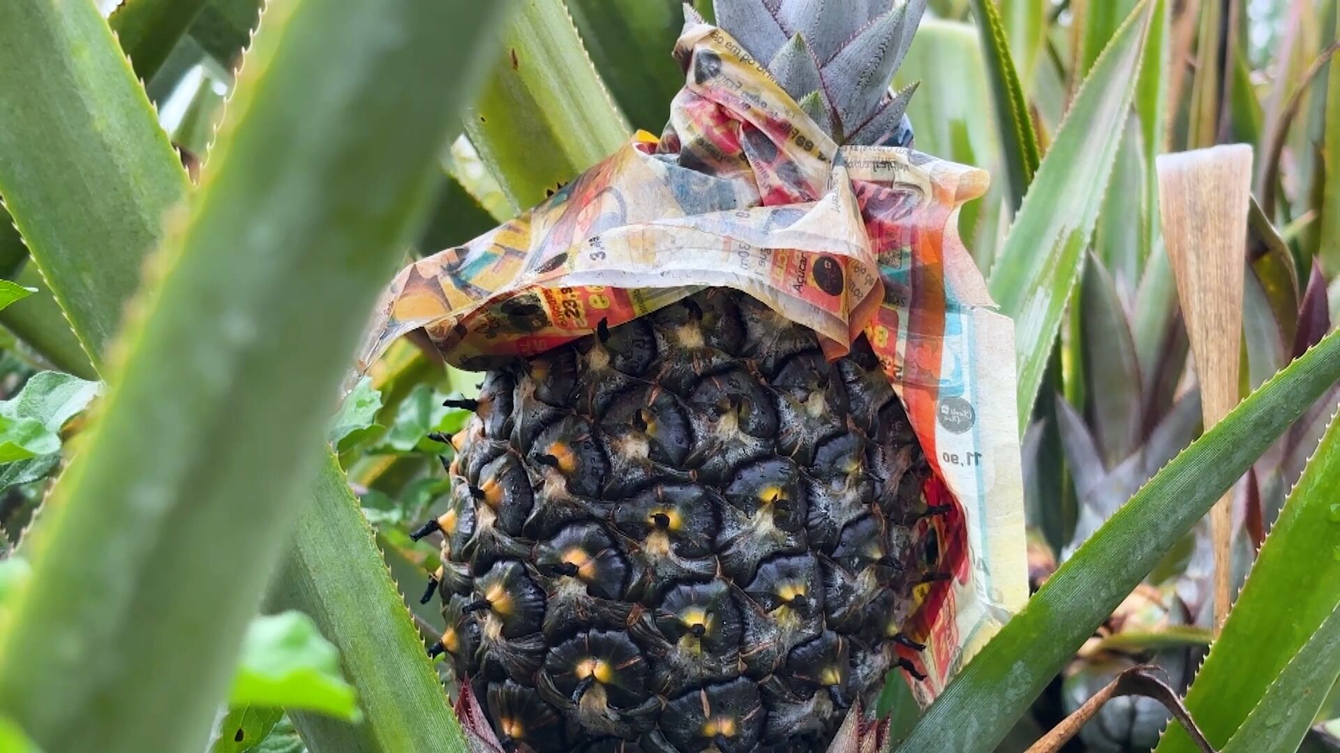 Esse cuidado não é somente com um único abacaxi, mas com todos os dois hectares de plantação, quase três campos de futebol. Cerca de 30 mil pés de abacaxi ocupam o espaço. A produção ocorre o ano inteiro e atenção é essencial por conta da delicadeza do fruto. O sabor depende do manejo, do clima e do cuidado diário. Nos períodos secos o talo, ou broto, é plantado. Thiago detalha que um dos métodos empregados para manter a qualidade do sabor é envolver os abacaxis com papelão ou jornais quando a colheita se aproxima, para impedir que o sol queime a fruta e altere o gosto.