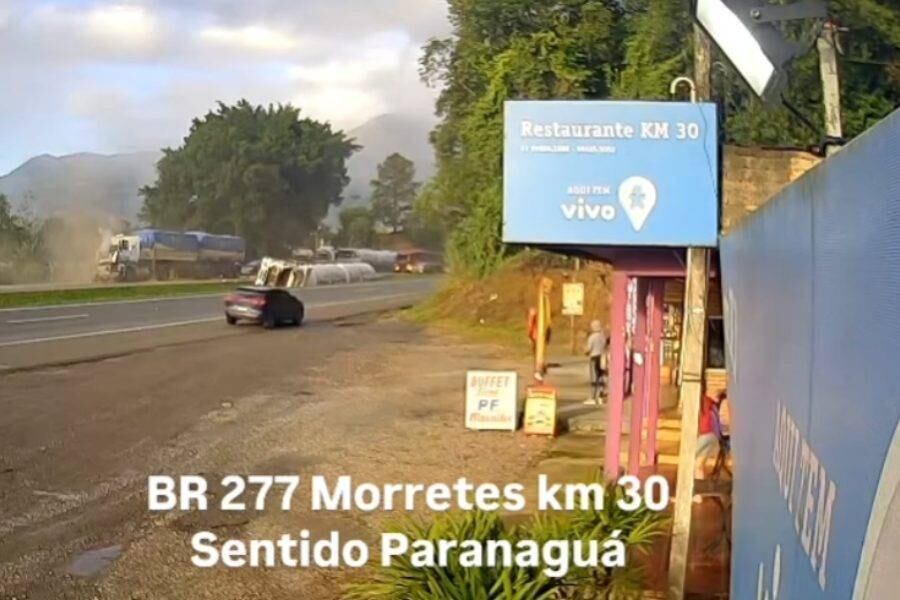 Foto: Reprodução / GrupoBR277Um acidente envolvendo três caminhões foi registrado na manhã desta quinta-feira (15) na BR-277, no trecho do município de Morretes, no Litoral do Paraná. A colisão ocorreu na pista sentido Paranaguá. De acordo com informações da EPR Litoral Pioneiro, um dos veículos tombou no canteiro central, provocando o derramamento da carga. Até o momento, não há confirmação sobre vítimas. O tráfego no sentido Paranaguá está sendo desviado para o acostamento. Equipes da concessionária responsável atuam na remoção dos caminhões e na limpeza da via.