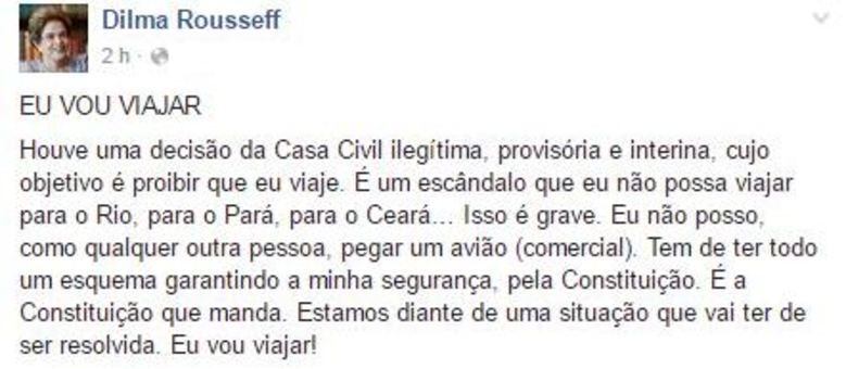 — Houve uma decisão da Casa Civil ilegítima, provisória e interina, cujo objetivo é proibir que eu viaje. É um escândalo que eu não possa viajar para o Rio, para o Pará, para o Ceará Isso é grave. Eu não posso, como qualquer outra pessoa, pegar um avião (comercial). Tem de ter todo um esquema garantindo a minha segurança, pela Constituição. É a Constituição que manda. Estamos diante de uma situação que vai ter de ser resolvida. Eu vou viajar!