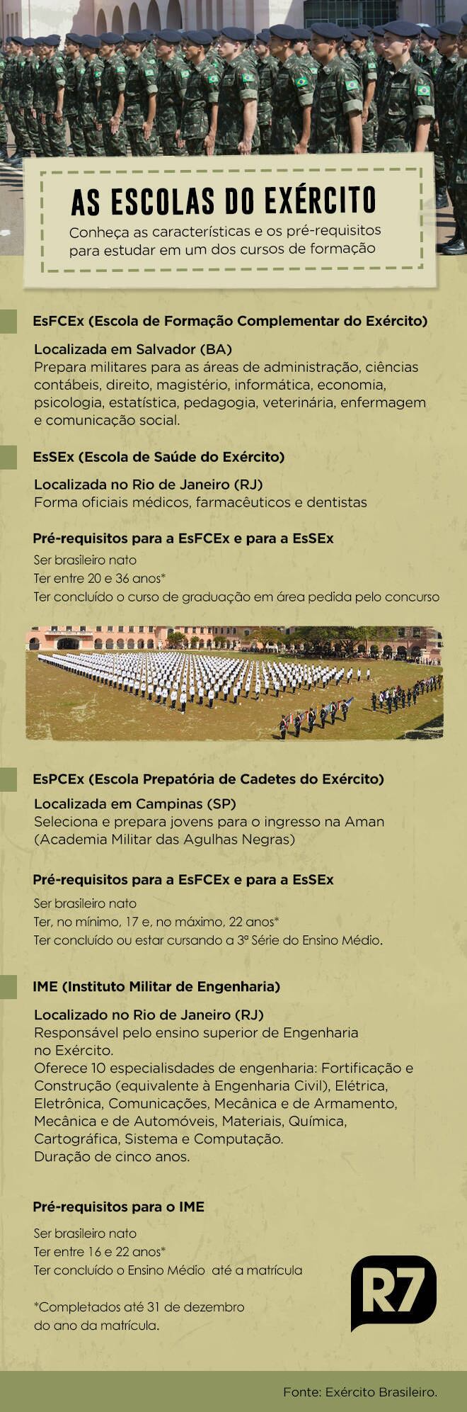 Em 2016, 49.632 candidatos se inscreveram para uma das quatro escolas do Exército: EsPCEx (Escola Preparatória de Cadetes do Exército), EsFCEx (Escola de Formação Complementar do Exército), EsSEx (Escola de Saúde do Exército) e IME (Instituto Militar de Engenharia) — conheça cada uma das escolas no quadro abaixo. Em 2018, foram 60.779 inscrições.