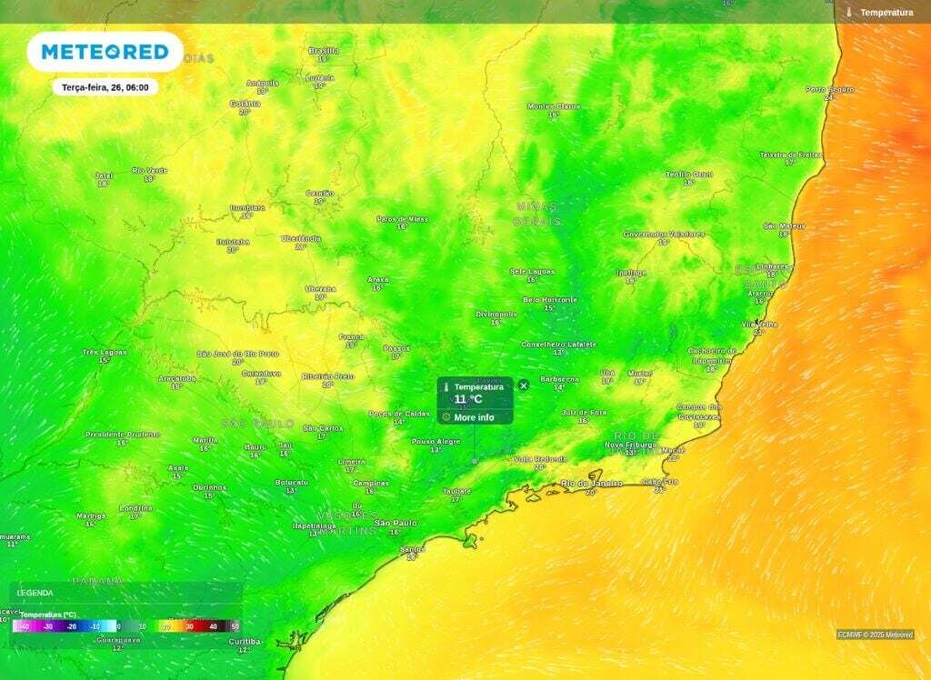 Esta terça-feira, 26, será marcada por condições severas de instabilidade sobre a Região Sul do Brasil, especialmente no Paraná e em Santa Catarina. A atuação de uma frente fria semi-estacionária, reforçada por um rio atmosférico — corredor concentrado de vapor d’água na atmosfera — cria cenário para chuvas intensas, que podem se aproximar ou ultrapassar 100 milímetros em pontos do litoral e áreas próximas da Serra do Mar. O risco maior está no período noturno e na madrugada de quarta-feira, 27, quando a percepção de perigo tende a ser reduzida.