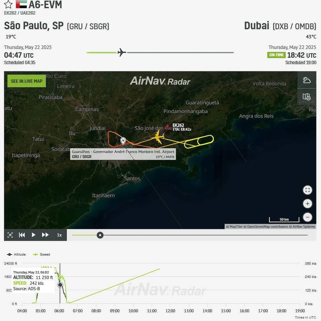 Uma aeronave Airbus A380, maior avião de passageiros do mundo e que opera diariamente no Aeroporto Internacional de São Paulo, em Guarulhos, precisou retornar ao ponto de origem depois de decolar na madrugada desta quinta-feira, 22.