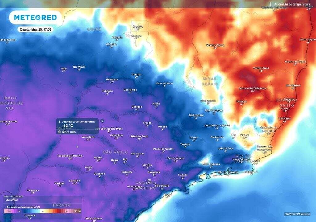 A quarta-feira, 25, será marcada por um dos dias mais frios do ano no Brasil, especialmente nas regiões Sudeste e Sul. Uma potente massa de ar polar avança sobre o país e derruba drasticamente as temperaturas, com chance de geadas. A previsão sugere registros negativos em diversas localidades e possibilidade de quebras de recordes históricos de frio.