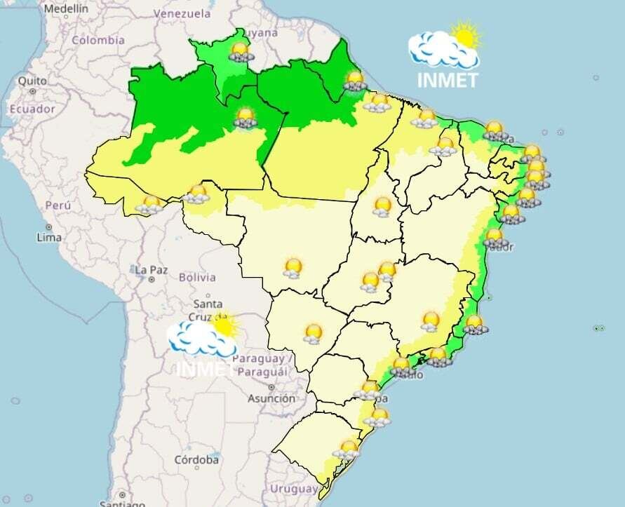 Em sua previsão do tempo para este domingo, 13, o Instituto Nacional de Meteorologia (Inmet) indica a ocorrência de chuva em partes do país. Grande faixa do litoral brasileiro e parte da Região Norte estão nessa condição.