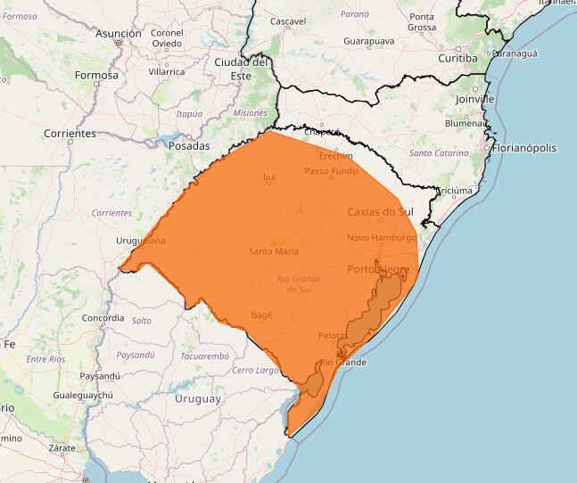O Instituto Nacional de Meteorologia (Inmet), mantido pelo Ministério da Agricultura e Pecuária, emitiu um alerta laranja para 445 dos 497 municípios do Rio Grande do Sul em decorrência da previsão de tempestades esperadas a partir das 15 horas desta segunda-feira, 16, até às 23 horas da próxima quinta-feira, 19.
