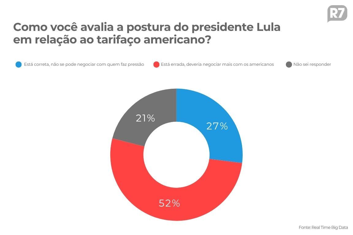 A sondagem indica ainda descontentamento em relação à atuação do governo brasileiro diante do tarifaço. Para 52% dos consultados, a postura atual está equivocada e o Planalto deveria reforçar o diálogo com os norte-americanos.