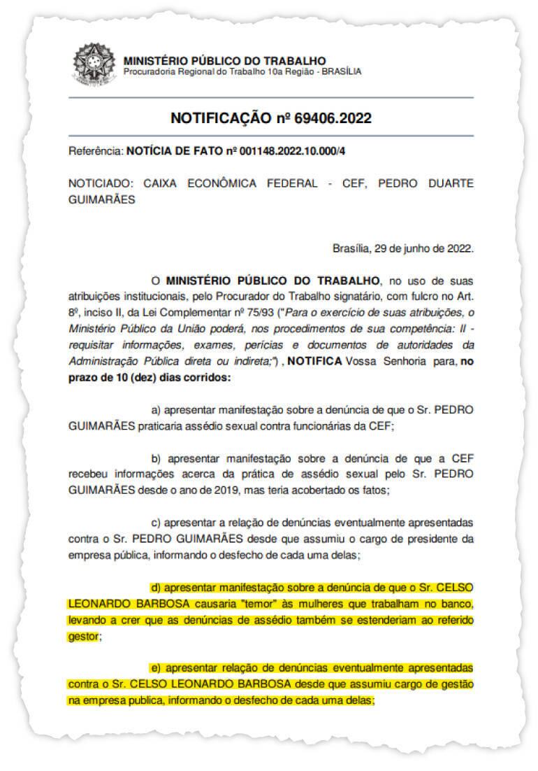 No documento, o MPT também notifica a Caixa da obrigação de informar a relação de denúncias de assédio sexual enviadas ao canal interno do banco desde 2019, indicando o desfecho de cada uma delas. Confira: