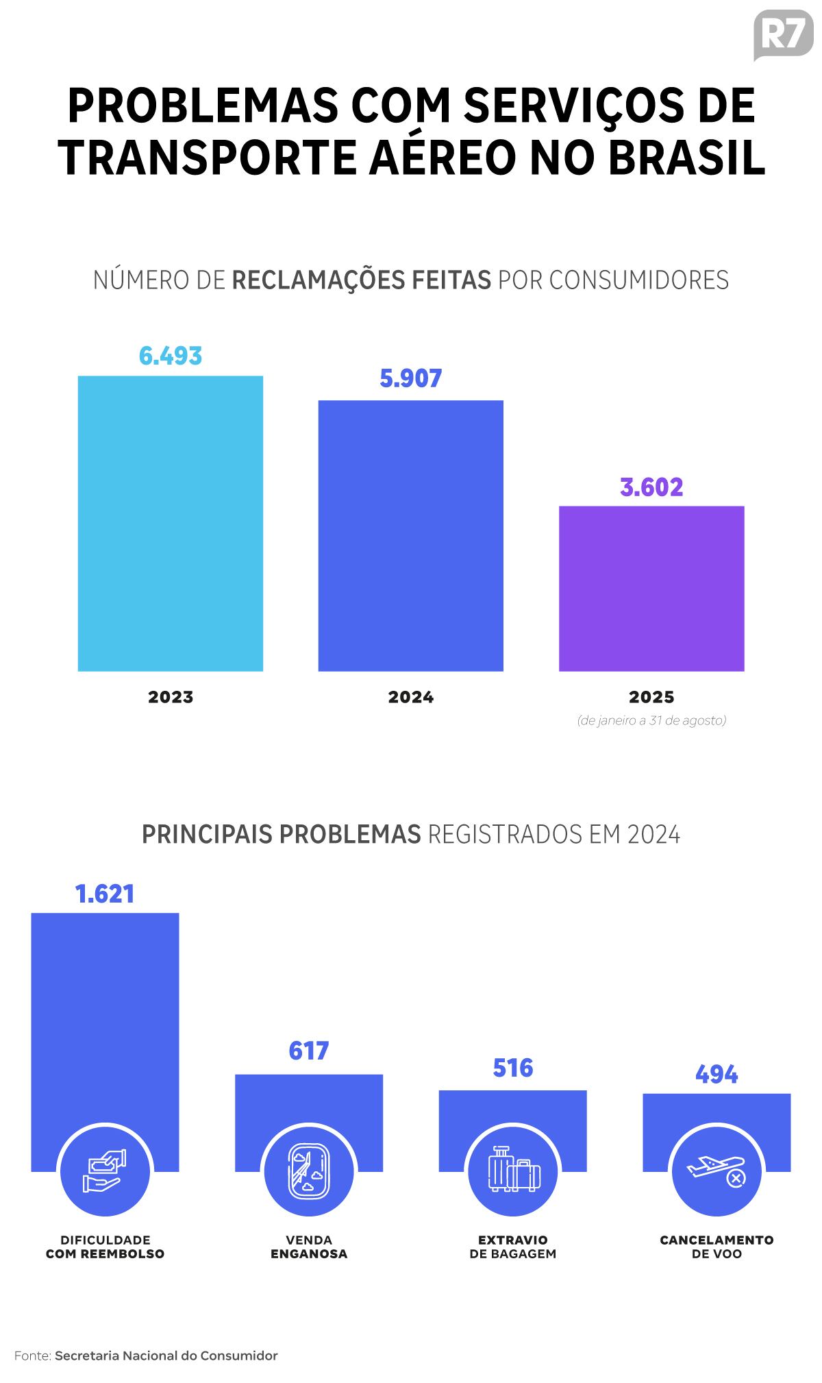 O Brasil registrou um número equivalente a 16 reclamações por dia por serviços prestados por empresas aéreas em 2024. Ao todo, foram 5.907 queixas de consumidores, segundo registros da Secretaria Nacional do Consumidor obtidos pelo R7.