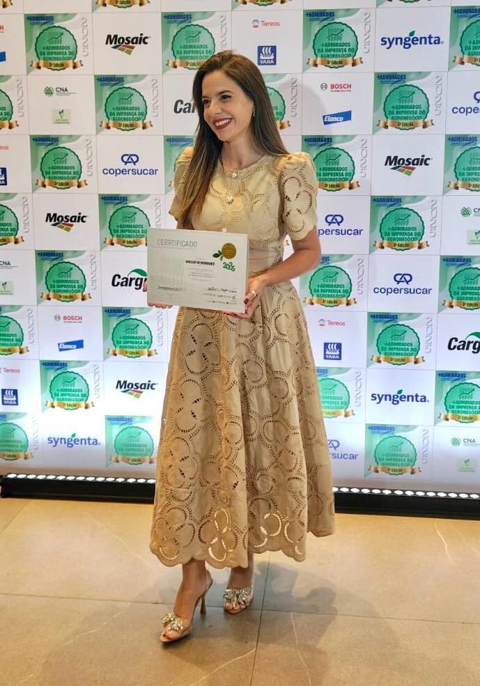 A apresentadora do Agro Record Brasília, Williane Rodrigues, foi uma das vencedoras do Prêmio +Admirados da Imprensa do Agronegócio 2025, na categoria Jornalista.