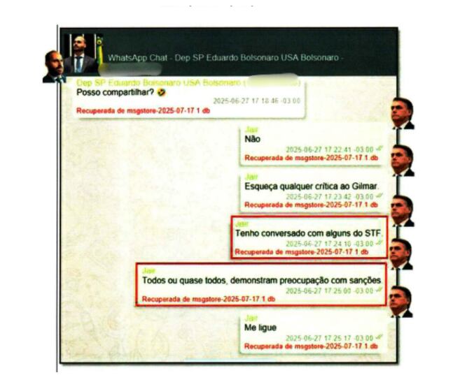 A conversa ocorreu em 27 de junho e começou com o envio de três imagens, que não foram recuperadas pelos investigadores. Eduardo perguntou ao pai se poderia compartilhar o conteúdo, mas Bolsonaro respondeu negativamente.