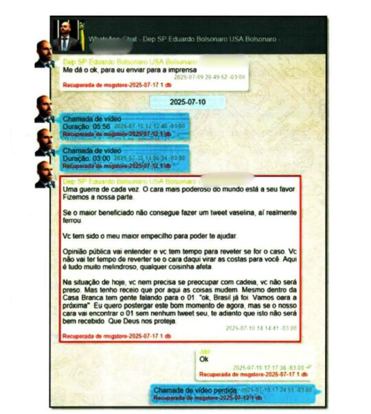 Já em 7 de julho, após postagens do presidente americano Donald Trump, Eduardo entrou em contato com o pai, em aparente resposta a uma tentativa de contato de Bolsonaro. “Imagino o que seja”, afirmou.