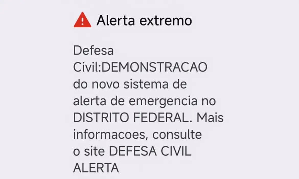 “Defesa Civil: Demonstração do novo sistema de alerta de emergência no Distrito Federal. Mais informações, consulte o site Defesa Civil Alerta”, dizia a mensagem.