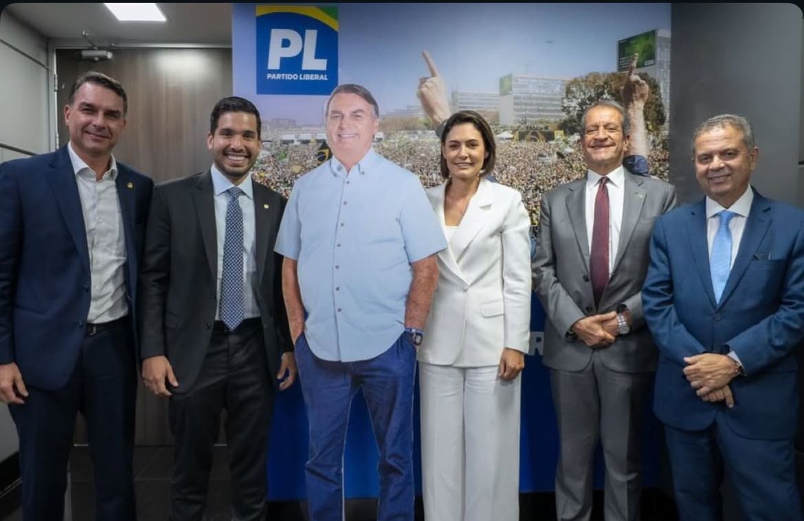 Na foto, Michelle aparece ao lado do senador Flávio Bolsonaro (PL-RJ), do deputado André Fernandes (PL-CE), e do presidente da sigla, Valdemar Costa Neto.