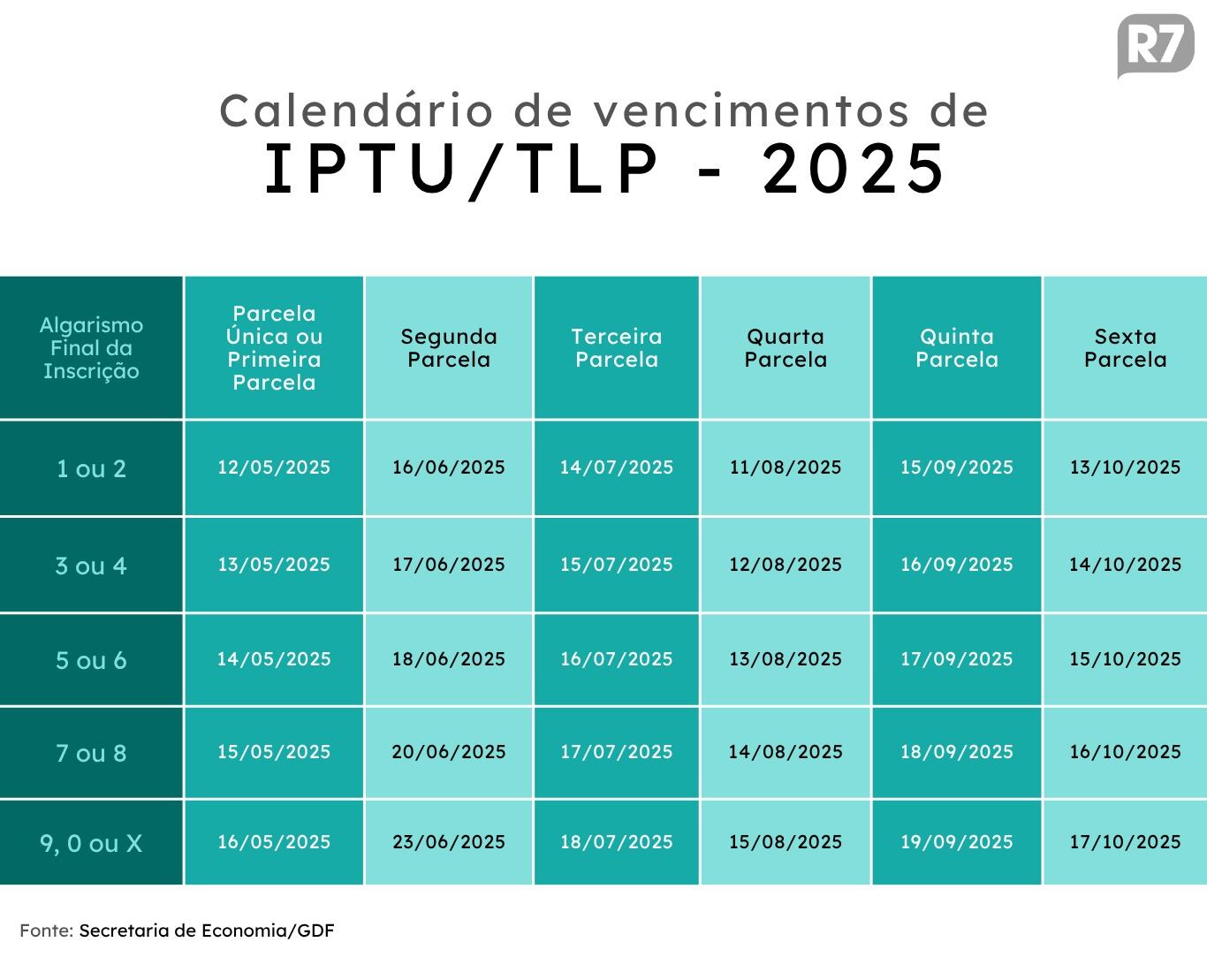 As datas de vencimento são definidas conforme o dígito verificador da inscrição do imóvel no CIDF (Cadastro Imobiliário do Distrito Federal). Os documentos com dígitos verificadores 1 e 2 devem ser quitados na segunda (11); 3 e 4, na terça (12); 5 e 6, na quarta (13); 7 e 8, na quinta (14); e 9, 0 ou X na sexta (15). Veja o calendário completo abaixo: