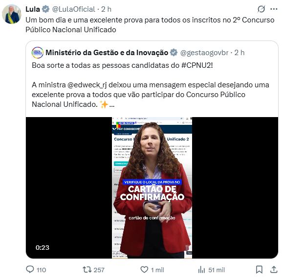 A publicação foi acompanhada de um vídeo da ministra da Gestão e da Inovação em Serviços Públicos, Esther Dweck, que também desejou boa sorte aos candidatos e reforçou informações sobre os horários e regras da aplicação das provas.