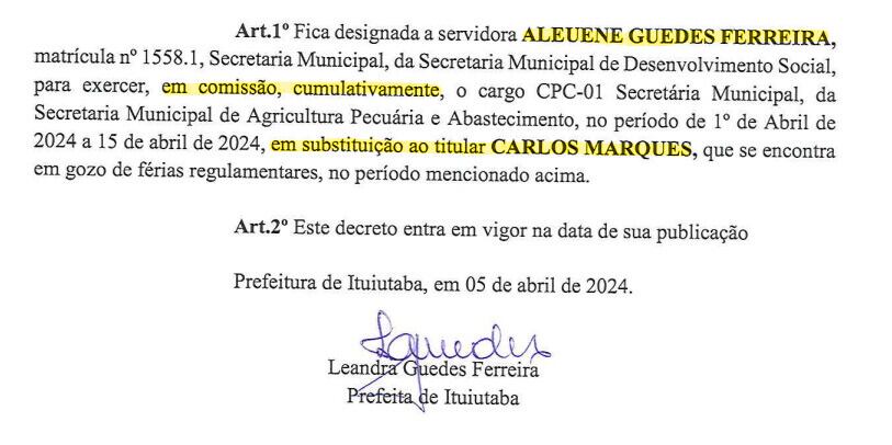 O marido de Aleuene, Carlos Marques, é secretário de Agricultura desde o início da gestão e recebeu, em julho, R$ 36.646,15 brutos. Em abril de 2024, durante as férias dele, Aleuene acumulou os dois cargos.