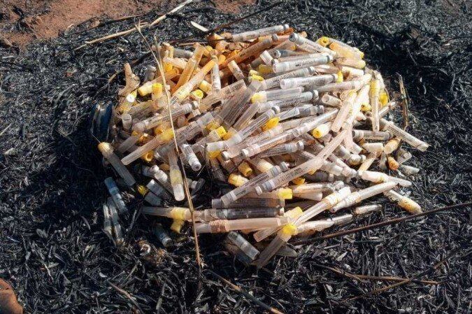 Seringas e agulhas foram encontradas por moradores no Parque Ecológico e Vivencial Recanto das Emas nessa terça-feira (31). O material foi localizado em uma área queimada.
