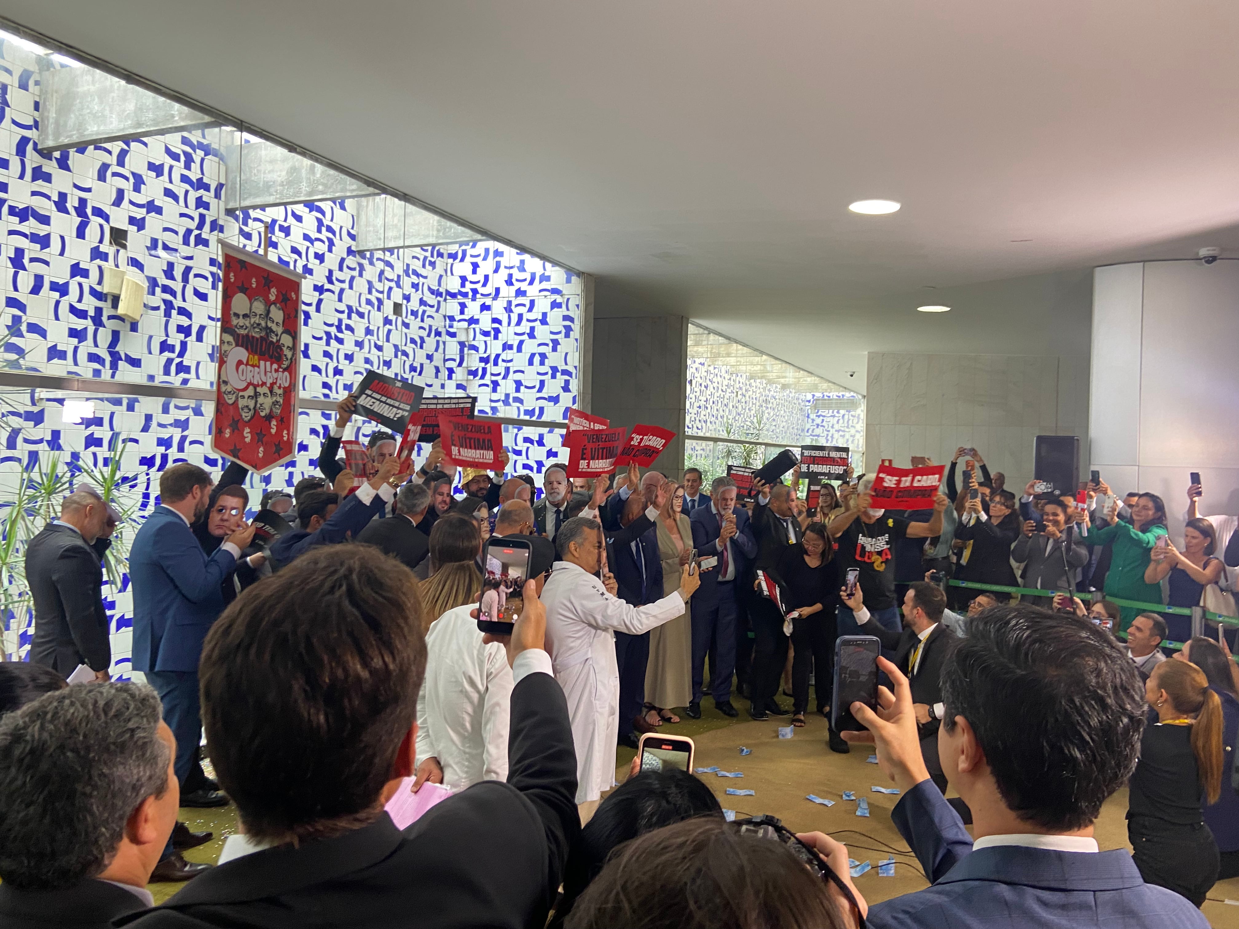 Ao fim do pronunciamento à imprensa, os deputados simularam um bloco de Carnaval, chamado “Unidos da Corrupção”, em protesto, com cartazes e alguns usaram máscaras do presidente Lula e da primeira-dama Janja.