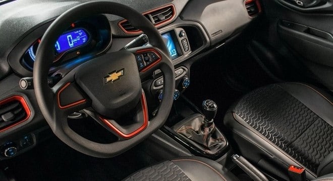 O interior do Effect é muito menos agressivo do que a versão Activ, que tem laranja para todo o lado, chegando até a cansar a vista depois de certo tempo. Quando sentamos no banco do motorista, nos deparamos com um volante diferente de qualquer outro da linha, possuindo borda inferior achatada e apliques em vermelho nos contornos na parte de dentro do volante que tem comandos, assistência elétrica e ajuste de altura — fica devendo o ajuste de profundidade. O conjunto da obra é um volante de boa empunhadura e com resposta rápida com a tela. As entradas de ar do painel também possuem a cor vermelha, assim como as costuras da base do câmbio e nas costuras dos bancos.