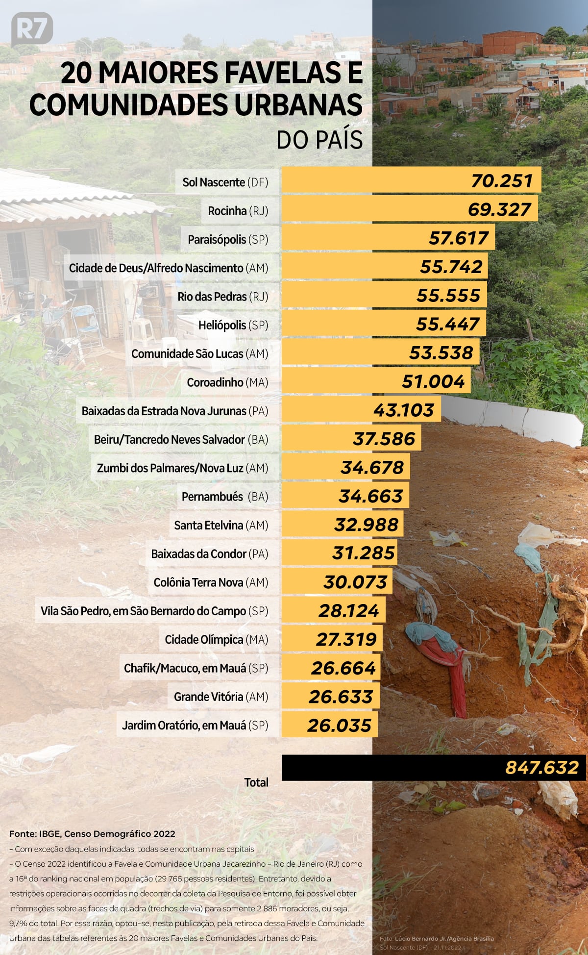 O Censo 2022 identificou 12.348 favelas e comunidades urbanas espalhadas pelo país, onde vivem 16.390.815 pessoas, aproximadamente 8% da população brasileira.