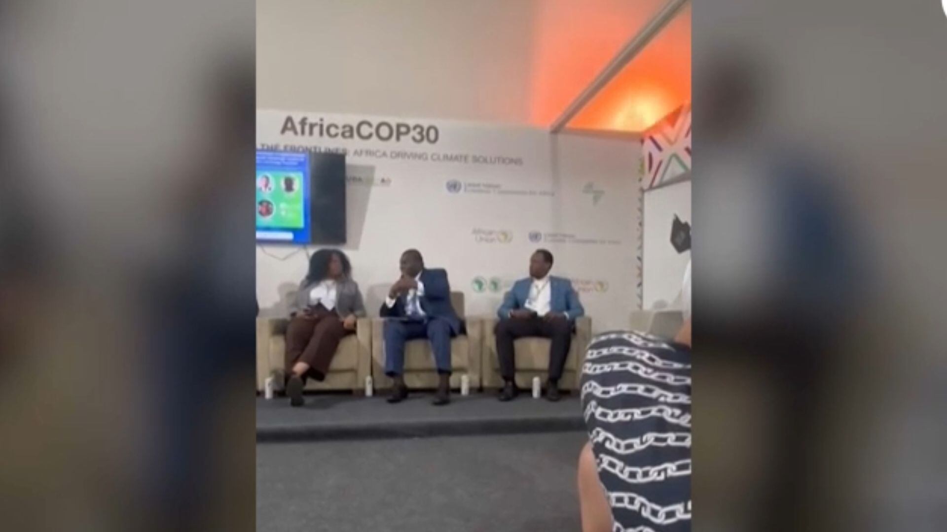Uma imagem gravada por um participante da COP30 mostra o momento do início do incêndio. O vídeo foi gravado durante um painel que abordava a atuação do continente africano em soluções climáticas.