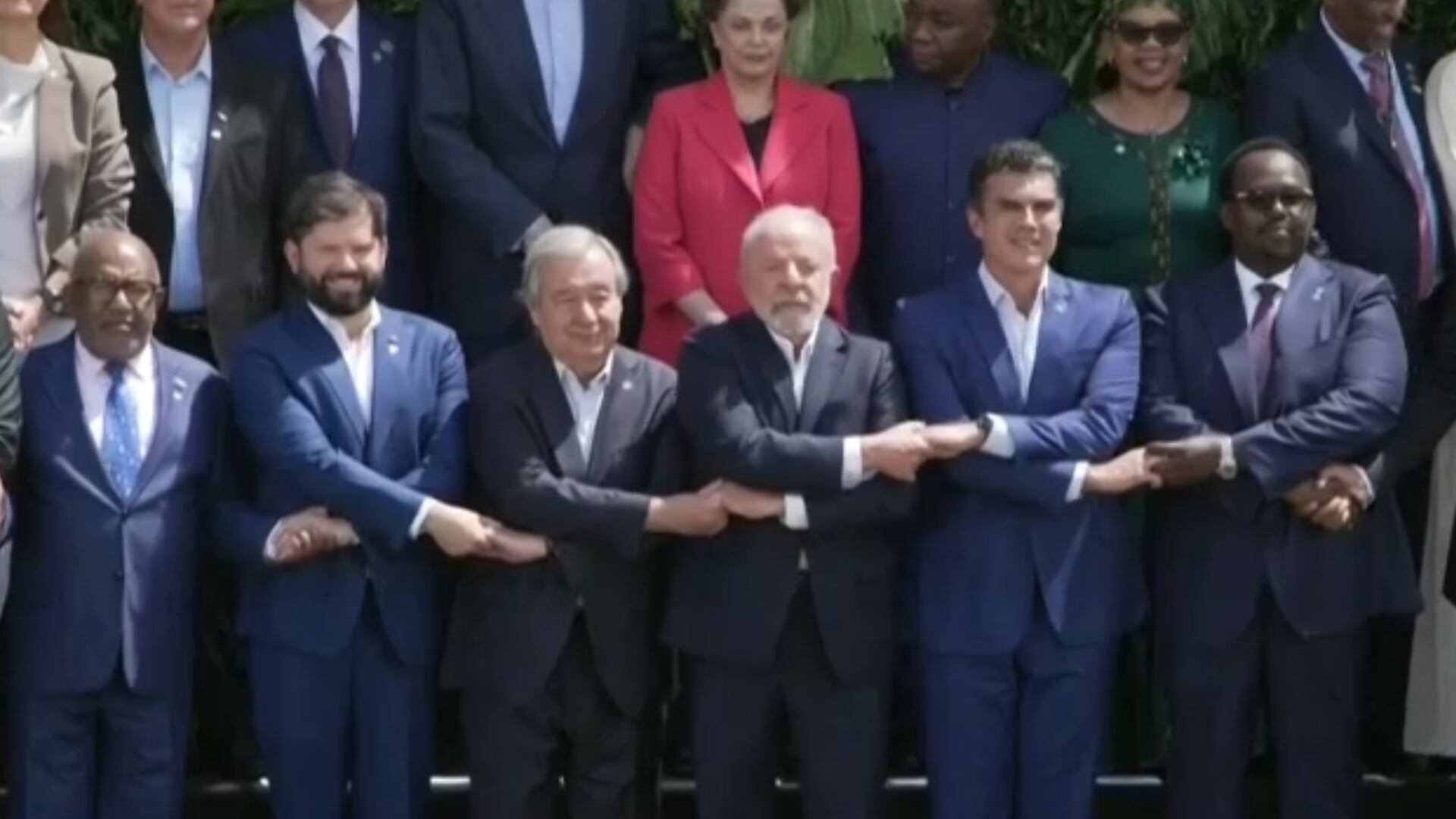 Com o presidente do Brasil, Luiz Inácio Lula da Silva, no centro da imagem, os mais de 40 líderes mundiais presentes posaram para o registro de mãos dadas e celebraram a reunião.