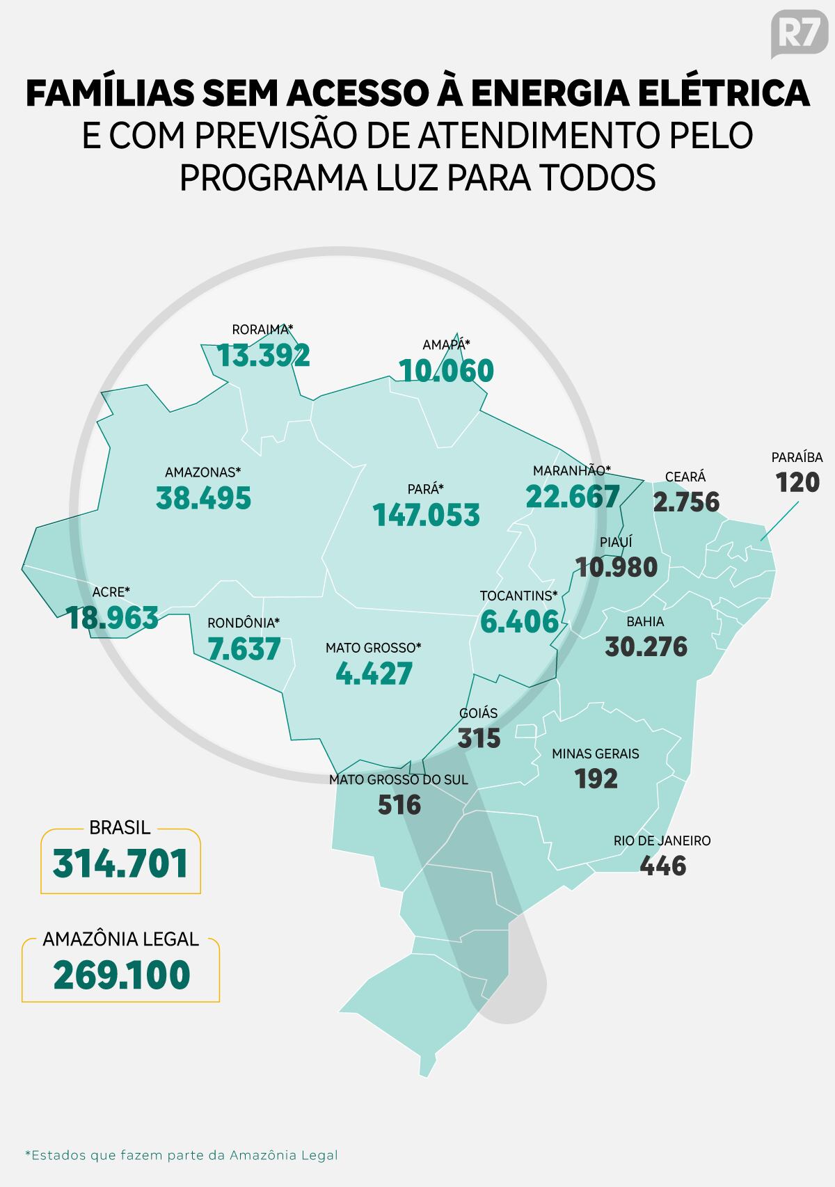 Até abril deste ano, 314 mil famílias brasileiras ainda não tinham acesso à energia elétrica, mas estavam previstas para serem incluídas no Programa Luz para Todos. Considerando uma média de três pessoas por família, isso representa cerca de 942 mil pessoas vivendo sem eletricidade no país.