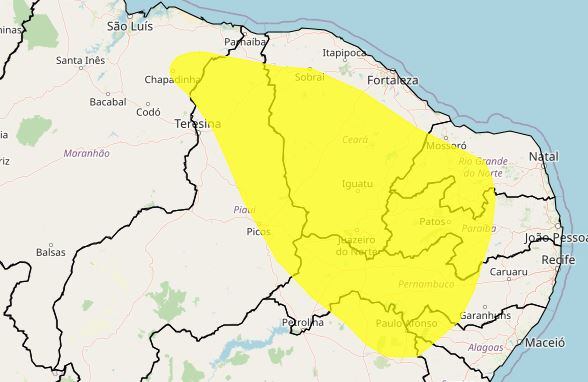 Para algumas cidades do interior do Rio Grande do Sul, especialmente na região de Bagé, e municípios do interior de todos os estados do Nordeste, o alerta amarelo é de baixa umidade.