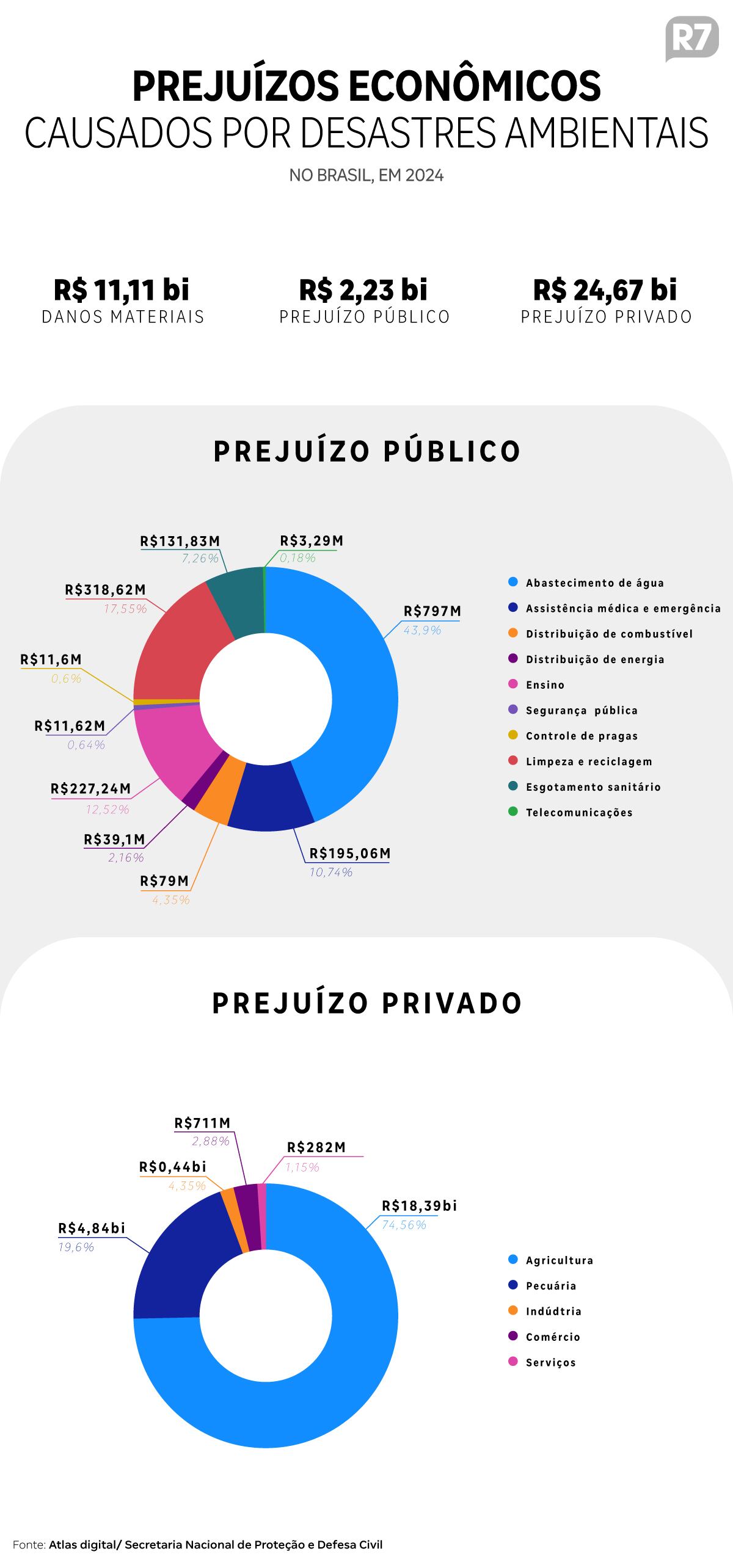Além disso, em 2024 os desastres naturais causaram uma perda econômica de R$ 2,23 bilhões no setor público e de R$ 24,67 bilhões no setor privado, com prejuízos principalmente na agricultura.