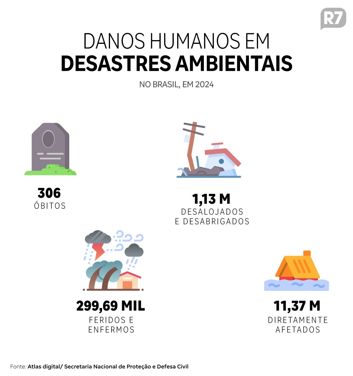 No Brasil, 306 pessoas morreram vítimas de tragédias ambientais em 2024, o que representa quase uma morte por dia. Esse número é um aumento de 58% em relação a 2023, que registrou 193 óbitos.