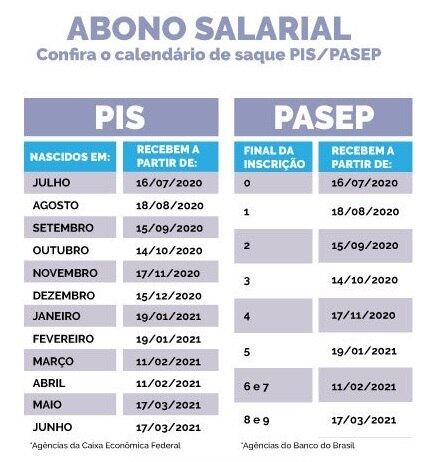 Os trabalhadores que nasceram entre julho e dezembro recebem o PIS ainda este ano. Os nascidos entre janeiro e junho terão o recurso disponível para saque em 2021. Os servidores públicos com o final de inscrição do Pasep entre 0 e 4 também recebem este ano. Já as inscrições com o final entre 5 e 9, no próximo ano.