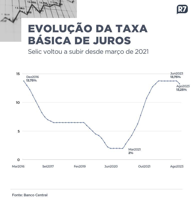 Iniciada em março de 2021, a escalada da taxa Selic até o maior patamar desde o fim de 2016 teve o objetivo de conter o avanço da inflação. No período, 12 altas seguidas resultaram na elevação dos juros básicos de 2% para 13,75% ao ano, nível atingido em agosto de 2022 e mantido desde então.