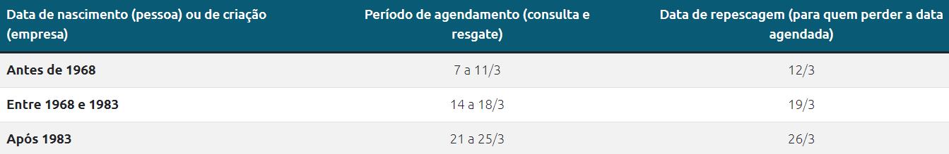 • Para pessoas nascidas ou empresas criadas após 1983, o agendamento ficará entre 21 e 25 de março, com repescagem no dia 26