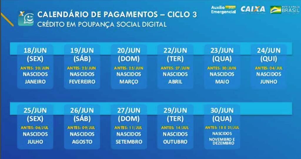 A terceira parcela do auxílio emergencial 2021 será paga nesta quinta-feira (24) para os trabalhadores que nasceram em junho, inscritos no CadÚnico (Cadastro Único do Governo Federal) ou por aplicativo, por meio de depósito nas contas digitais criadas para movimentar o benefício.