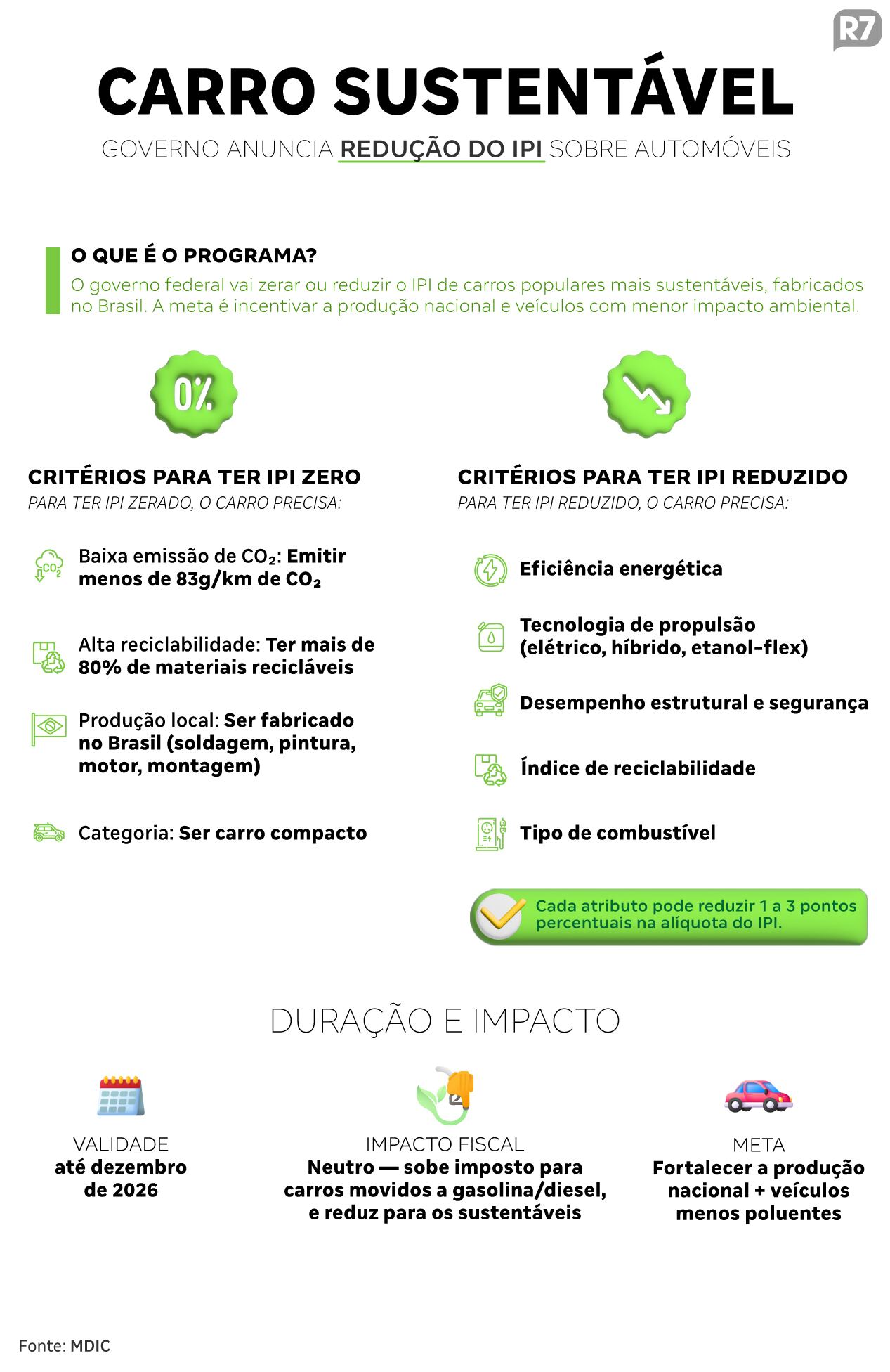 Segundo o governo, apesar de zerar o IPI, o Carro Sustentável não tem impacto fiscal. O programa tem validade até dezembro de 2026, antes de os efeitos da reforma tributária entrarem em vigor — com as mudanças nos impostos, o IPI será zerado para praticamente todos os produtos até 2027.