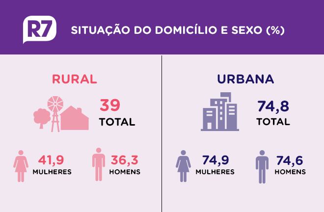 De acordo com a pesquisa, nas regiões rurais, 41,9% dos usuários de internet são mulheres contra 36,3% de homens. Nas áreas urbanas, a diferença entre sexos é menor: 74,9% são mulheres e 74,6% homens.
