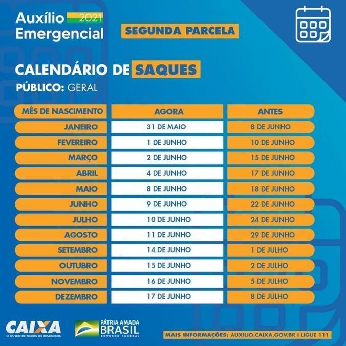 Também nesta terça-feira, os participantes do Bolsa Família começaram a receber a segunda parcela do novo auxílio emergencial. Esse grupo segue o calendário regular de pagamento do programa, que é realizado nos dez últimos dias úteis de cada mês, de forma escalonada, de acordo com final do NIS (Número de Identificação Social).