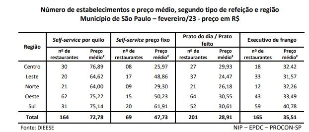O custo do prato do dia/prato feito em fevereiro, considerando todas as regiões da cidade, era R$ 28,91. A refeição mais barata nessa modalidade foi encontrada na zona leste, com valor médio de R$ 24,47, e a mais cara, a R$ 30,61, na zona sul.