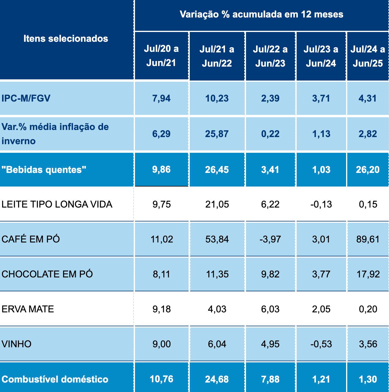 O preço do café em pó acumula alta de 89,6% em 12 meses e lidera a inflação entre os produtos mais consumidos no inverno. É o que mostra levantamento do Instituto Brasileiro de Economia da Fundação Getulio Vargas (FGV Ibre), com base no Índice de Preços ao Consumidor - Mercado (IPC-M).