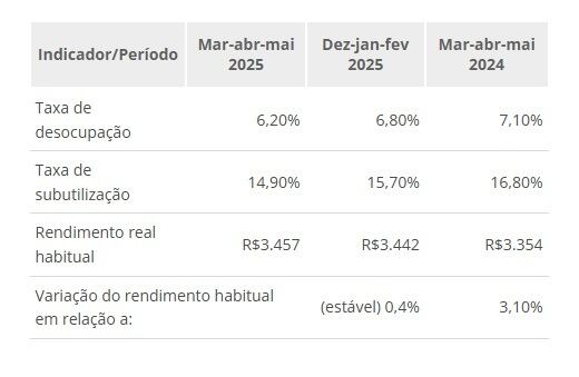 A taxa de desocupação, de 6,2%, no trimestre encerrado em maio de 2025, teve variação negativa de −0,6%, perante o trimestre de dezembro de 2024 a fevereiro de 2025, 6,8%. A taxa caiu 1 ponto porcentual ante o trimestre móvel de março a maio de 2024, que ficou em 7,1%. O Instituto Brasileiro de Geografia e Estatística (IBGE) publicou os dados nesta sexta-feira, 27.