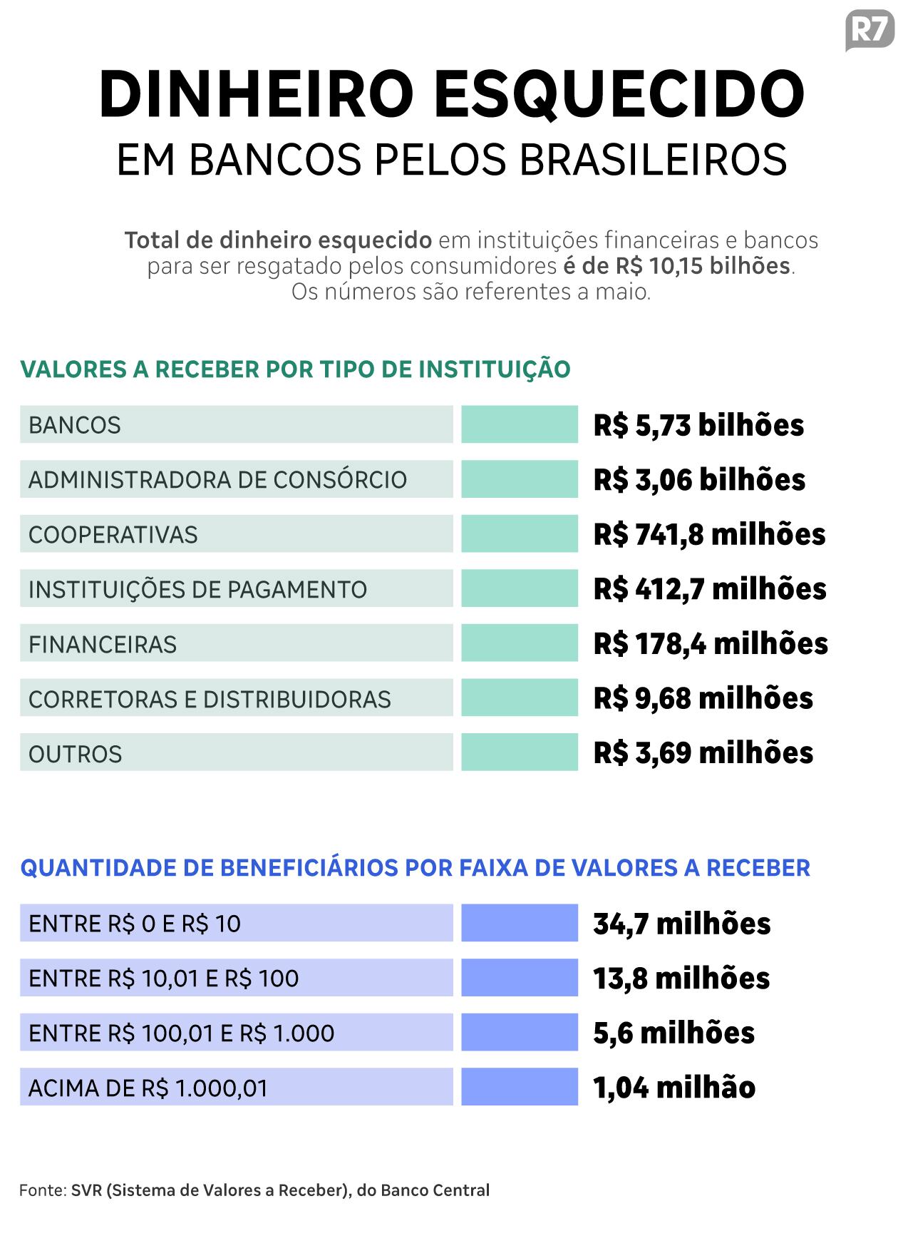 O total de dinheiro esquecido em instituições financeiras e bancos para ser resgatado pelos consumidores ultrapassou os R$ 10 bilhões. O SVR (Sistema de Valores a Receber), do Banco Central, atualizou nesta terça-feira (8) o valor para devolução em R$ 10,15 bilhões.