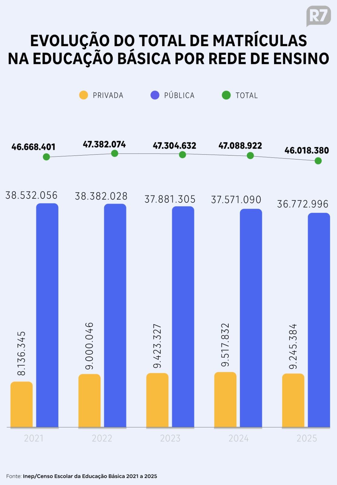 O número de matrículas na educação básica registrou uma queda de 1,07 milhão de alunos em 1 ano no Brasil, mostram dados do Censo Escolar. Entre os anos de 2024 e 2025, a rede pública teve uma redução de 2,1%, enquanto a rede privada reduziu 2,9%. Apesar do valor, o Ministério da Educação atribui a queda à influência de fatores demográficos e melhoras na eficiência do sistema educacional.