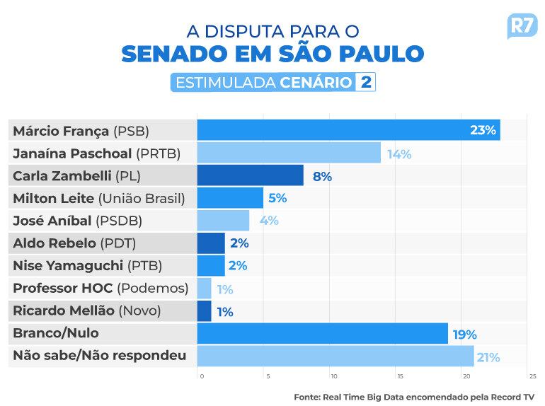 O ex-governador de São Paulo Márcio França (PSB) lidera em todos o cenários as intenções de voto para o Senado no estado. É o que aponta a pesquisa do instituto Real Time Big Data encomendada pela Record TV. A jurista e deputada estadual Janaína Paschoal (PRTB) vem em segundo lugar, também em todos os cenários do levantamento.