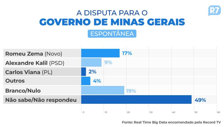 Na pesquisa espontânea (em que o nome dos candidatos não é apresentado), Zema segue na liderança, com 17% das intenções de voto, Kalil tem 9%, e Viana, 2% das intenções de voto para o governo do estado. Os votos brancos e nulos são 19%, enquanto 49% dos entrevistados disseram que não sabem ou não responderam.