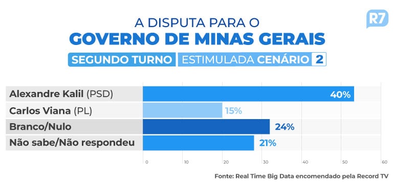 Em um eventual segundo turno na corrida ao Palácio das Mangabeiras, Romeu Zema teria 49% dos votos, e Alexandre Kalil, 39%. Votos brancos e nulos e os eleitores que não sabem ou não responderam são 6%.