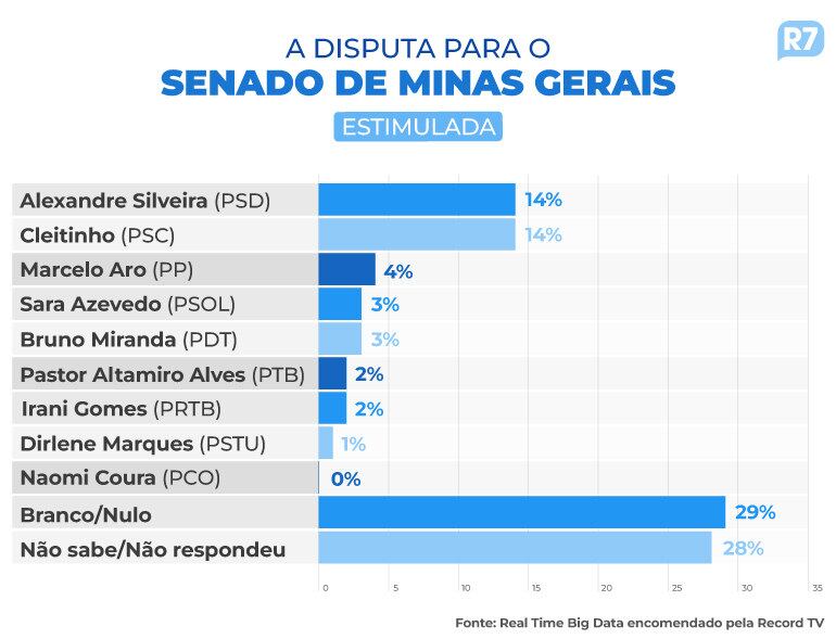 Entre os candidatos ao Senado pelo estado de Minas Gerais, Alexandre Silveira (PSD) e Cleiton Azevedo estão empatados, com 14% das intenções de voto cada um. Marcelo Aro (PP) aparece na terceira colocação, com 4%, seguido por Sara Azevedo (PSOL), que tem 3%. Considerando-se a margem de erro de 3 pontos percentuais, eles também estão empatados na terceira colocação.