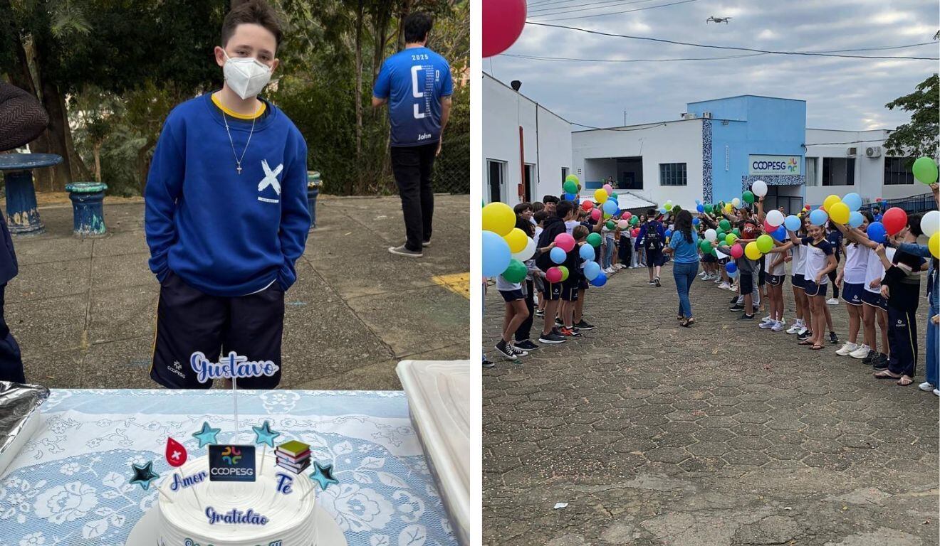Foto: Acervo pessoal Balões coloridos, abraços, gritos de felicidade e confete colorido. O capixaba Gustavo Colombi Bruow, de 12 anos, foi recebido com uma grande festa pelos amigos ao retornar para escola após realizar um tratamento contra a leucemia e passar por um transplante de medula óssea.
