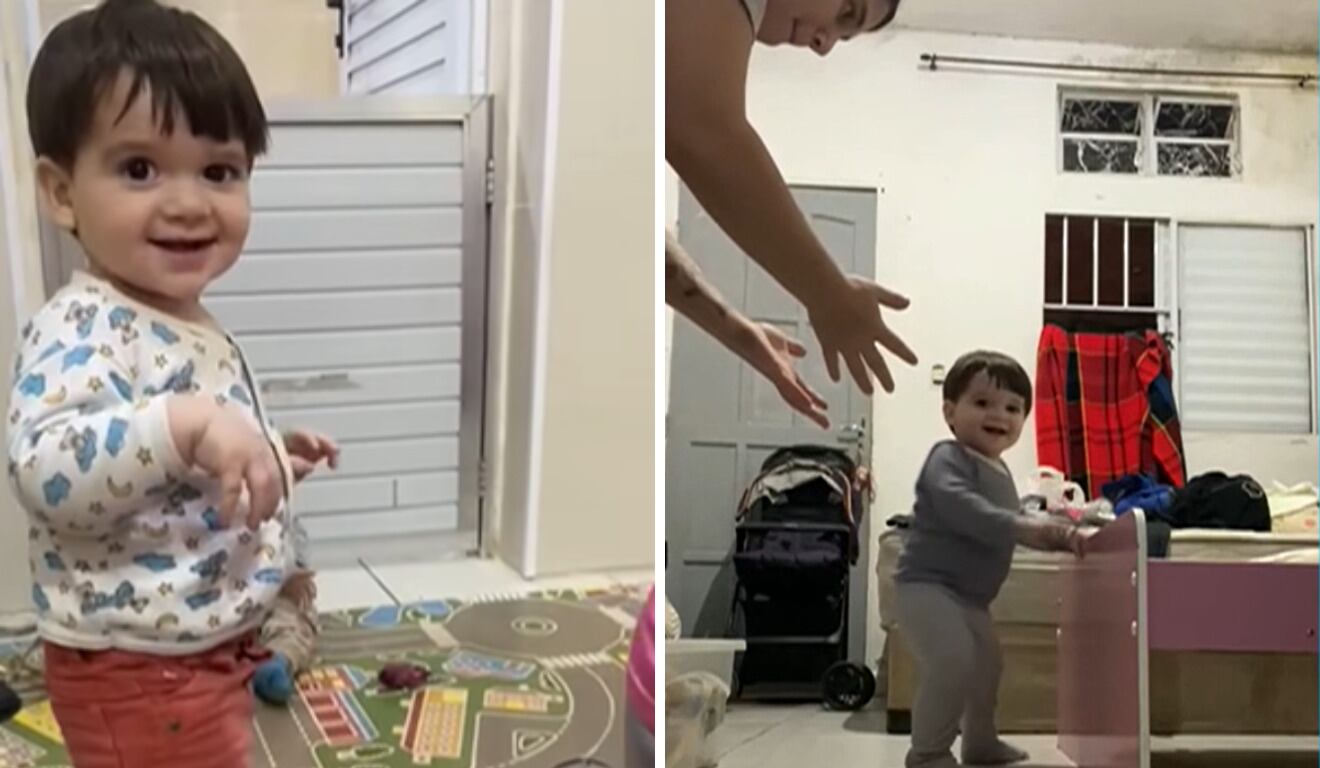 Arthur, de um ano, já andava sozinho na creche, mas fingia não caminhar em casa para receber mais atenção/Foto Reprodução. O bebê Arthur, de um ano, deu os primeiros passos dentro de casa, mas sua mãe, Lyvian, descobriu que, na verdade, o menino já andava na creche.